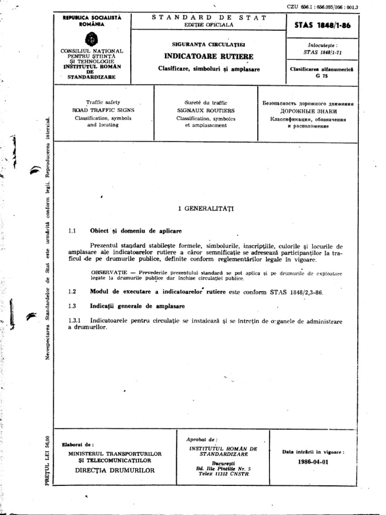 vizitati articolul complet aici : https://www.scribd.com/document/354444408/STAS-1848-1-7-2004-Indicatoare-si-mijloace-de-semnalizare-rutiera-pdf Vehiculului care circul pe banda de lng acostament sau bordur i se apropie de o staie pentru mijloace de transport public de persoane prevzut cu alveol, fa de conductorul unui astfel de vehicul. De la ce distanta fata de vehiculul care circula din sens opus, pe timp de noapte, conducatorul unui autovehicul este obligat sa foloseasca lumina de. Vehiculele pe ine care excut virajul la stnga pierd prioritatea fa de vehiculele care circul din sens opus.